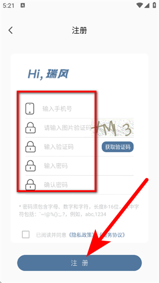 4、在注册页面,输入手机号,设置密码,勾选后,点击注册,完成账号注册。