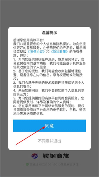1、打开鞍钢商旅软件,在弹出的温馨提示页面阅读相关内容,然后点击同意按钮。
