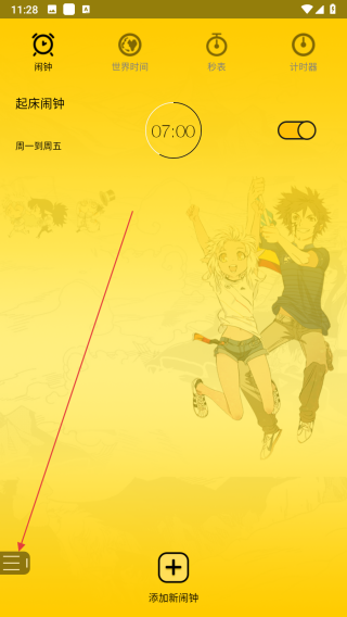 1、打开二次元闹钟APP,点击界面左下角的菜单按钮。