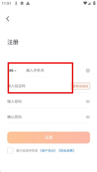 2、进入注册页面后,输入手机号,并填写收到的验证码。