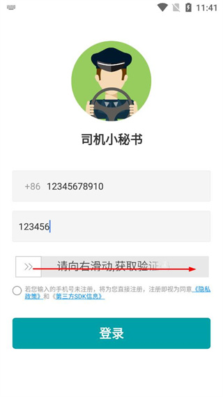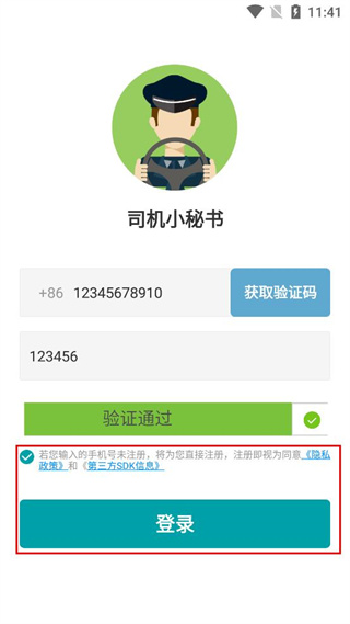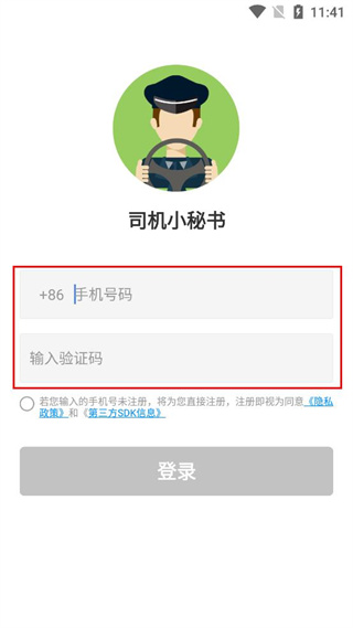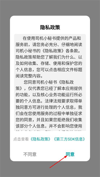 1、打开司机小秘书APP,查看弹出的隐私政策提示,点击界面中的同意按钮进入应用。