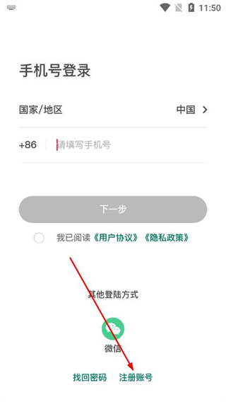 1、在悦小妖体脂秤对应的APP登录页面,点击注册账号选项,进入手机号注册界面。