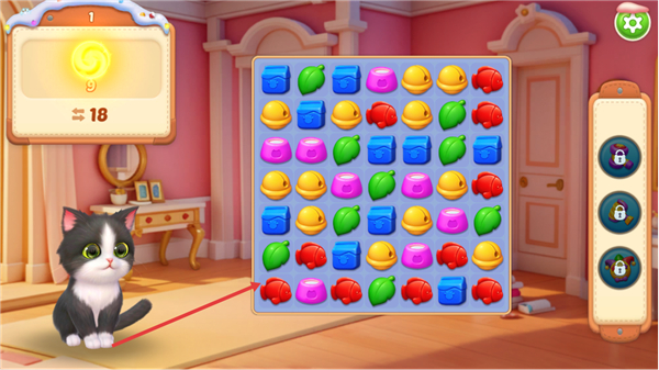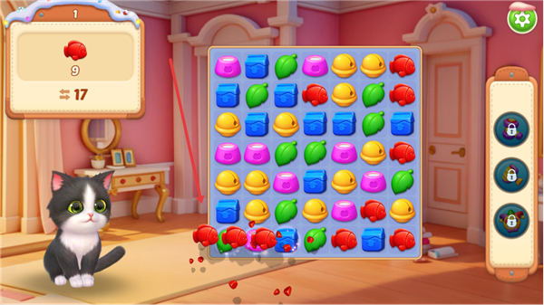 2、多重玩法深度融合,以经典三消为核心,串联家园建造与萌宠养成玩法,消除闯关获取的资源可用于装修房屋、解锁猫咪互动道具,玩法环环相扣不单调。