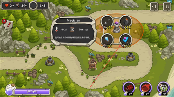 2、解锁Magician塔,其可眩晕敌人,消耗资源建造该塔,增强防御效果。