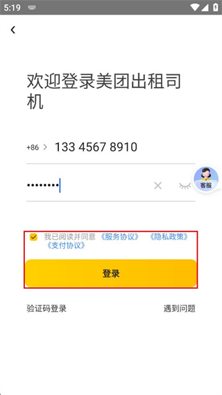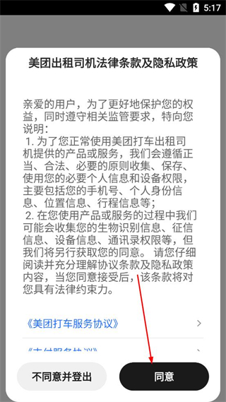 1、打开美团出租司机,阅读法律条款及隐私政策内容,确认后点击同意按钮。