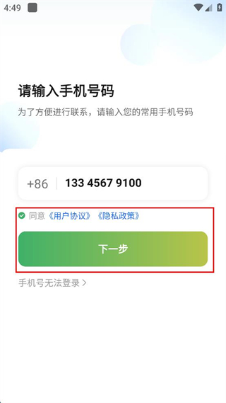 2、进入请输入手机号码页面,在对应输入框中填写常用的手机号码信息。