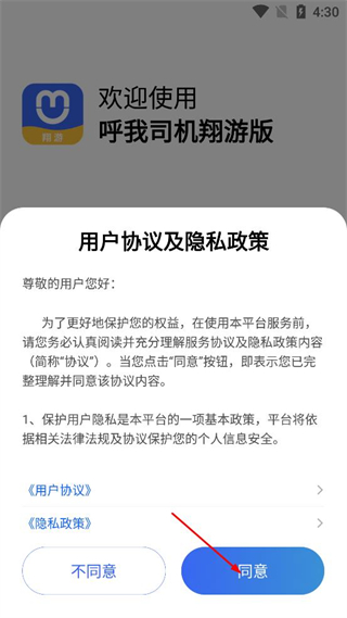 1、打开呼我司机翔游版,阅读用户协议及隐私政策内容,确认后点击同意按钮。