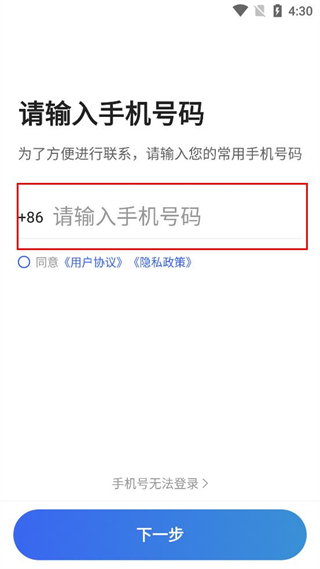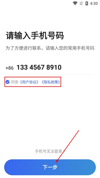 3、完成手机号填写与协议勾选后,点击页面下方的下一步按钮继续操作。