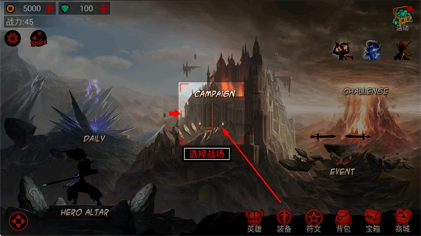 1、在游戏主界面点击CAMPAIGN区域的选择战场,进入战役模式的选择界面。
