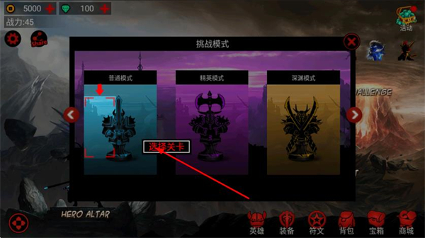 2、在挑战模式选择界面中,选中普通模式并点击选择关卡,进入对应的关卡准备挑战。