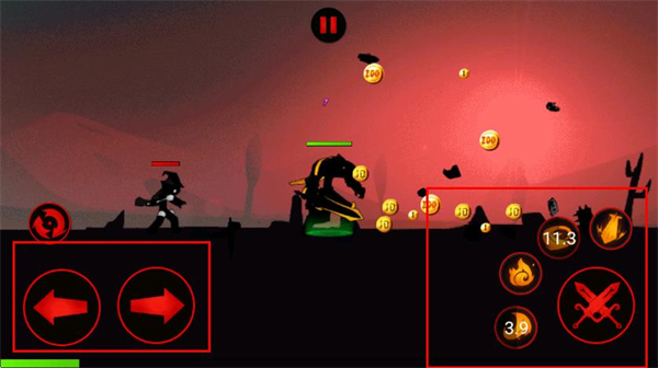 3、进入战斗界面后,通过左侧方向键控制火柴人移动,点击右侧技能按钮释放技能,击败敌人推进战斗进程。