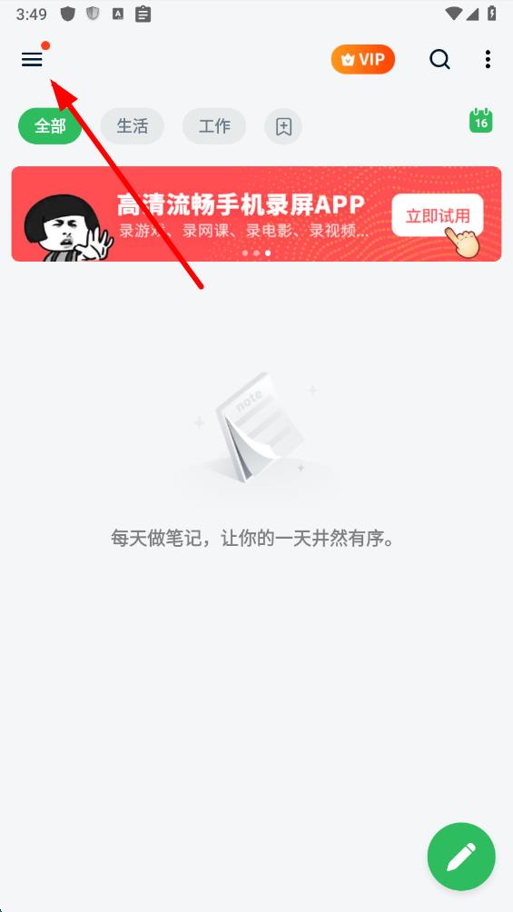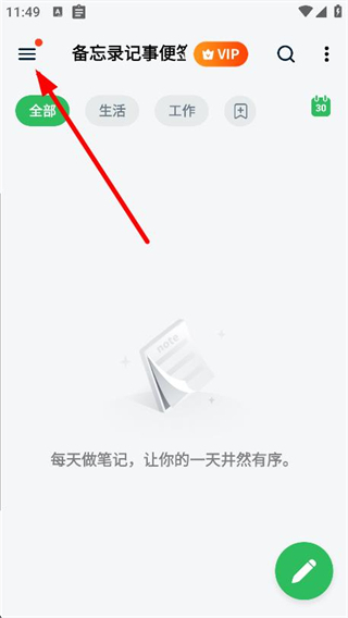 1、打开备忘录随手记app,点击界面左上角的三条横线图标,打开侧边栏菜单。