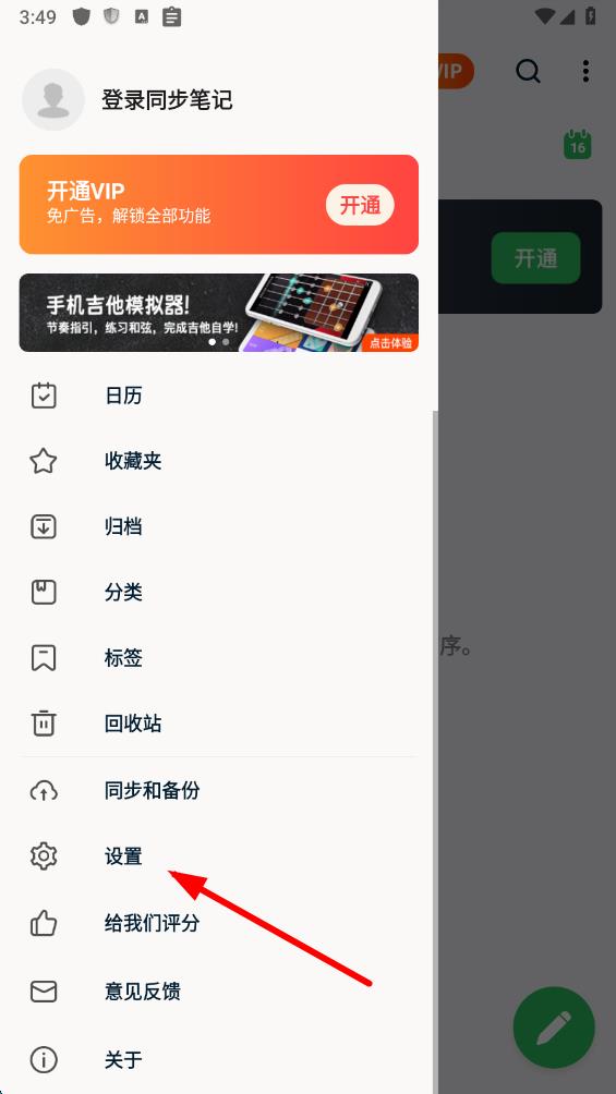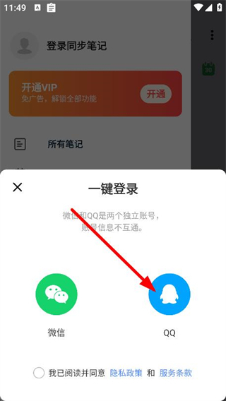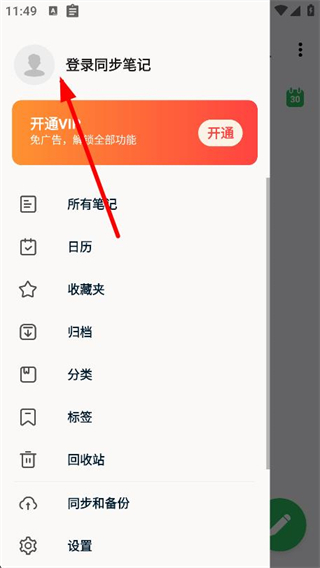 2、在弹出的菜单中,点击登录同步笔记选项。