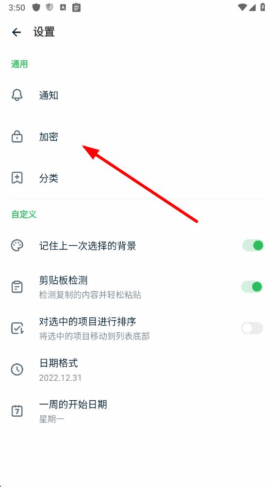 3、在设置页面里,点击加密选项,进入加密设置界面,以管理应用的安全防护功能。