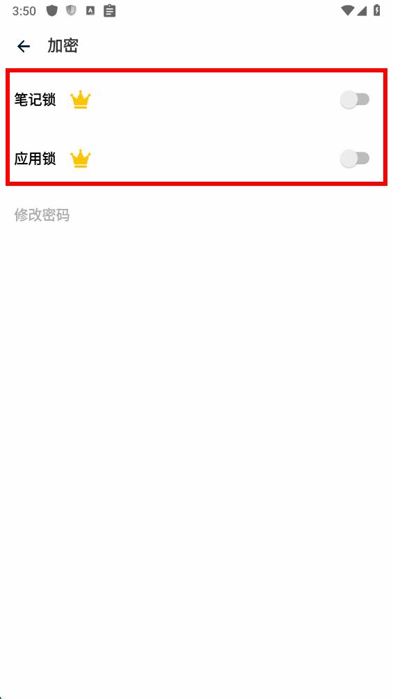 4、在加密设置界面,找到笔记锁和应用锁选项,点击开启相应的开关,根据提示完成密码设置等操作,即可为笔记和应用添加密码保护。