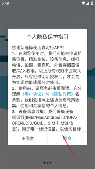 1、打开嘉定行,看到个人隐私保护指引弹窗,点击同意按钮。