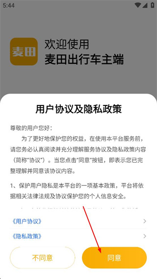 1、打开麦田出行车主端,看到用户协议及隐私政策弹窗,点击同意按钮。