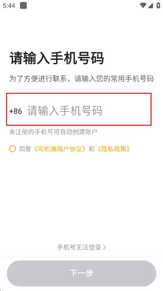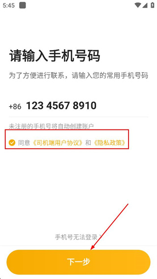 3、勾选同意司机端用户协议和隐私政策选项,点击下一步按钮继续操作。