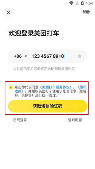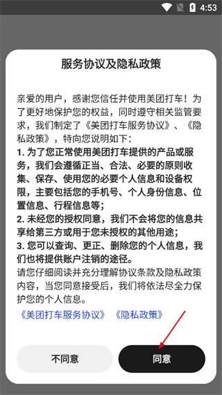1、阅读美团打车的服务协议及隐私政策内容,确认后点击页面下方的同意按钮。