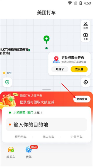 2、进入美团打车主界面,看到定位权限提示后,点击立即登录选项进入登录页面。