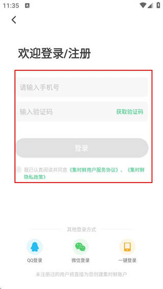 3、在登录页面,填写集时鲜并勾选协议后,点击登录按钮即可完成账号登录。