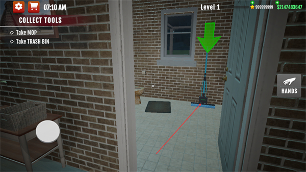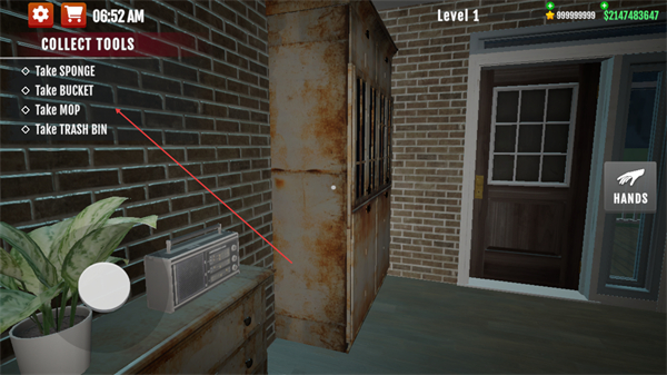 3、前往卫生间区域,拾取拖把,推进工具收集进度。