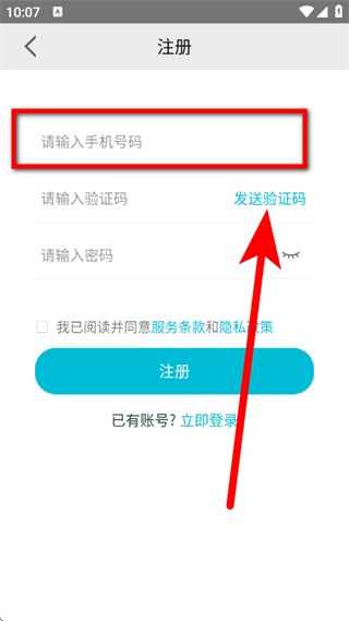 3、在注册页面,输入手机号码,点击获取验证码。